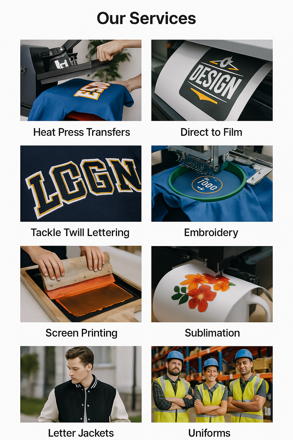 Your one-stop shop for custom apparel, gear, and team pride. From heat press to embroidery, from varsity jackets to corporate polos — we bring your vision to life.